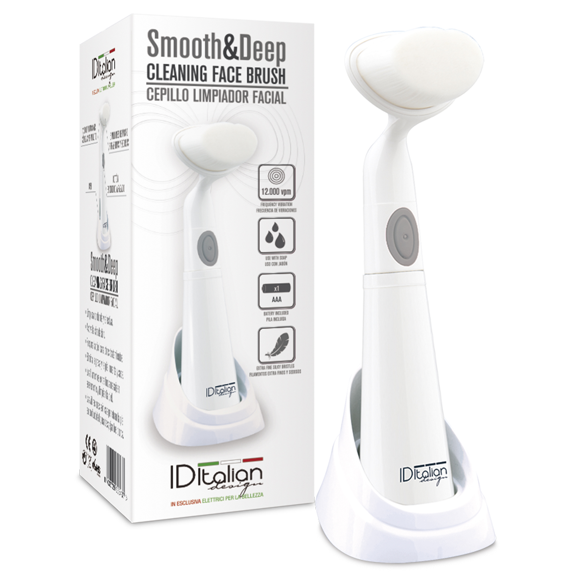 The refurbed Italian Design Smooth & Deep Facial brush is a deep and effective facial cleansing brush. It activates blood circulation and prepares the skin for further treatments. It is useful for removing oil, dead skin and dry skin. Extra-fine filaments gently massage and cleanse the skin. Sonic vibrations penetrate deep into the skin and cleanse the pores.